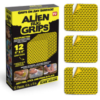 Keep your rugs and carpets securely in place with Alien Tape Pre Cut Carpet Grips. This 12-piece set of 4” x 4” reusable double-sided adhesive pads is engineered with strong grip technology to prevent sliding and bunching on smooth surfaces. Perfect for wood, tile, marble, or granite floors, these weather-resistant, non-toxic mounting pads leave no sticky residue and can be reused multiple times. Ideal for home, office, or outdoor areas, Alien Tape carpet grips provide a safe, stable, and hassle-free flooring solution for everyday use.