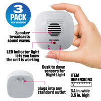 The Bell Howell Ultrasonic Electronic Indoor Pest Repeller w is an easy and safe way to keep your home pest-free. The ultrasonic repellers emit high-frequency sound waves that are inaudible to humans and pets but repel pests such as mice, rats, spiders, and ants. The unique design of these repellers allows them to be plugged into any AC outlet without obstructing the second outlet. The devices have a built-in dusk-to-dawn sensor that automatically turns on the night light and ultrasonic waves at night and off during the day, saving energy and ensuring continuous protection. The compact size and discreet design make them ideal for use in any room of your home. Simply plug them in and let them do their job without the need for any harmful chemicals or messy traps. Keep your home pest-free with the Bell Howell Ultrasonic Electronic Indoor Pest Repeller with AC Outlet 3-Pack.